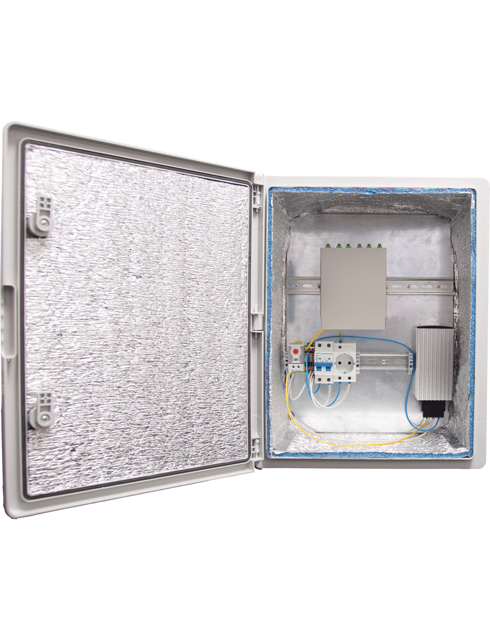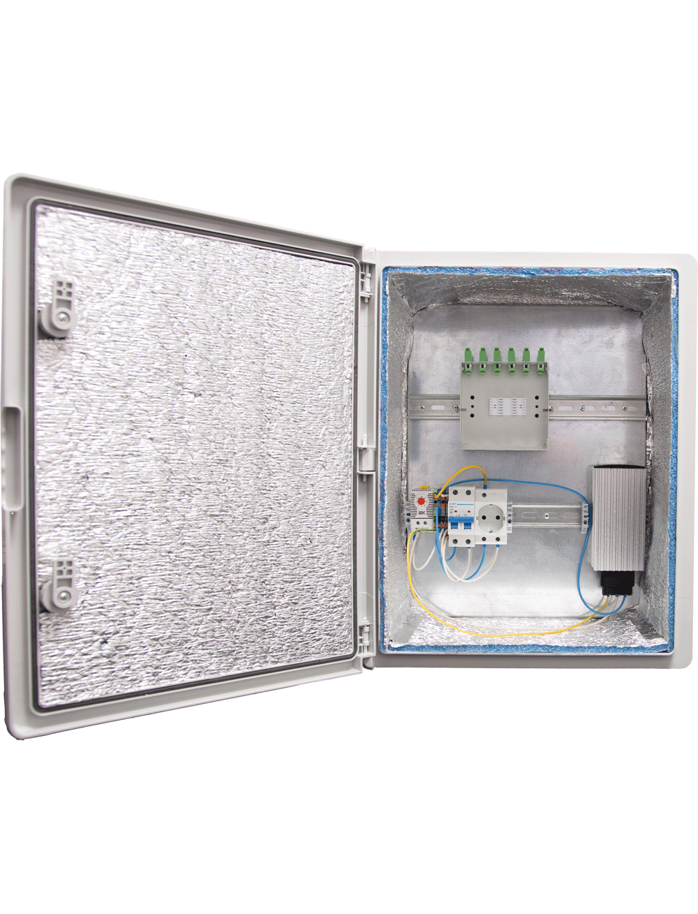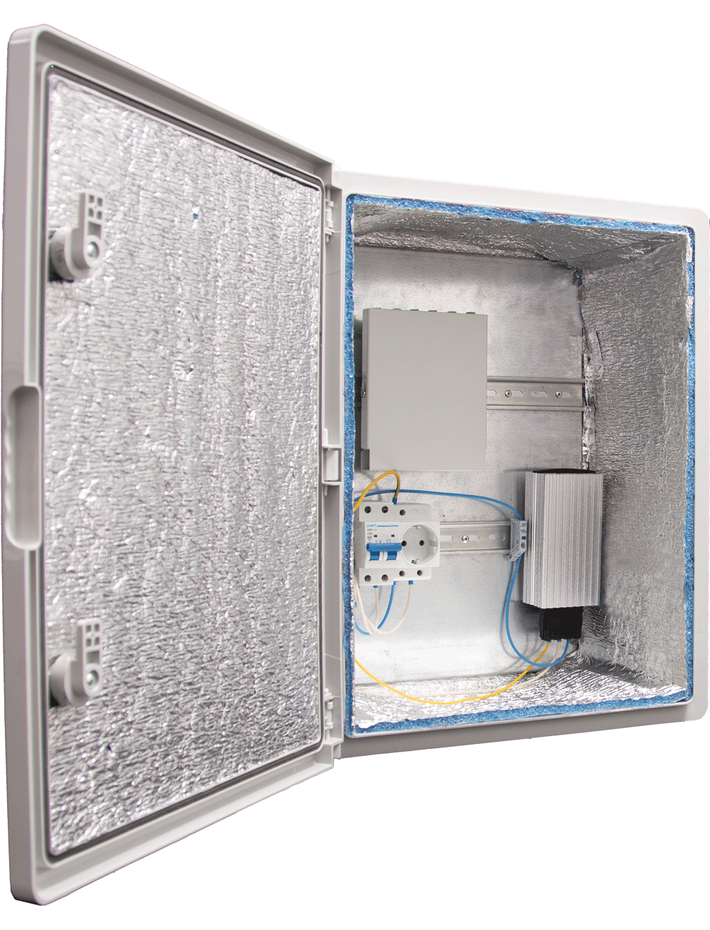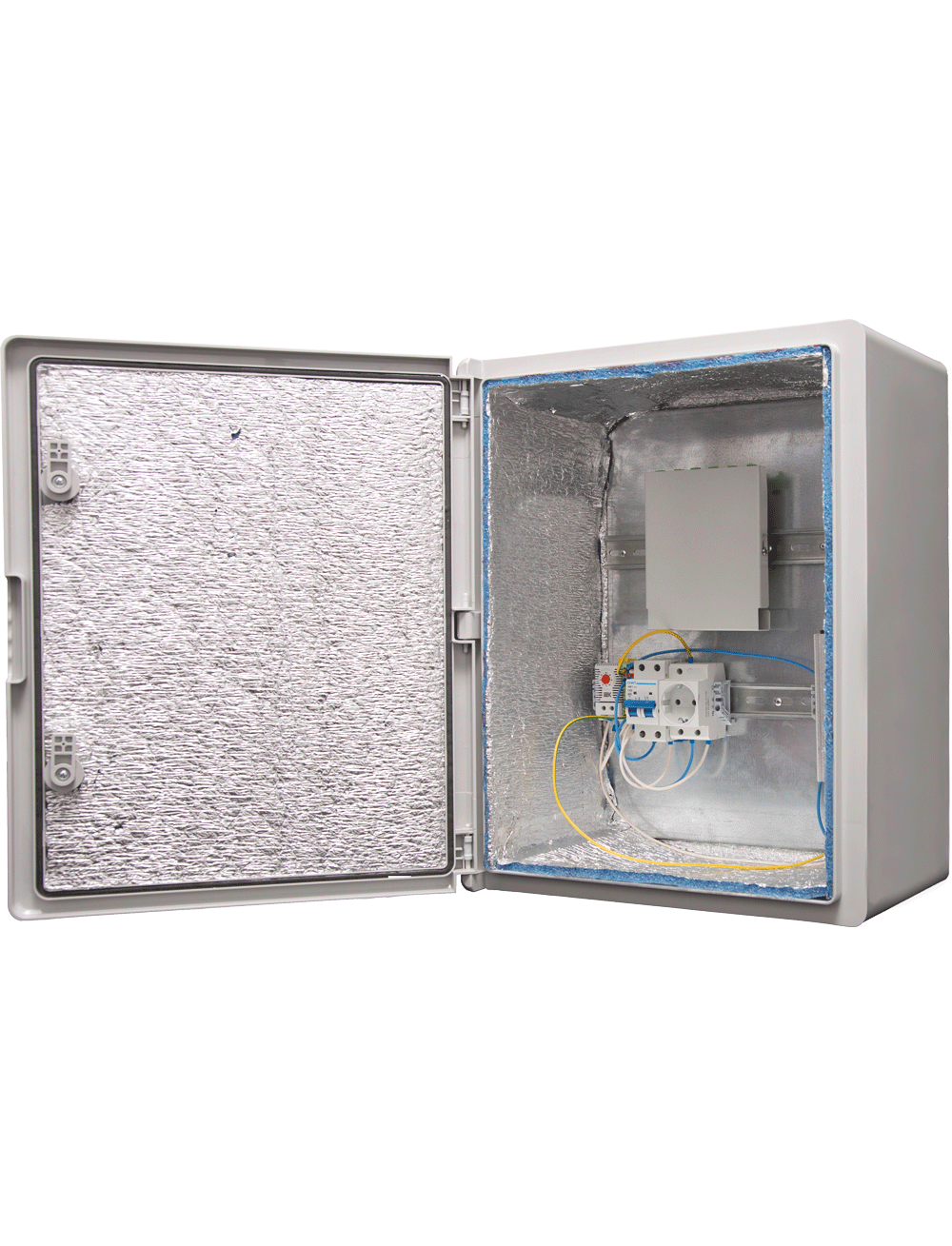 Корпус выполнен из ударопрочного ABS пластика для надежной защиты оборудования от воздействия окружающей среды. Внутренняя поверхность корпуса и двери оборудована фольгированным утеплителем.