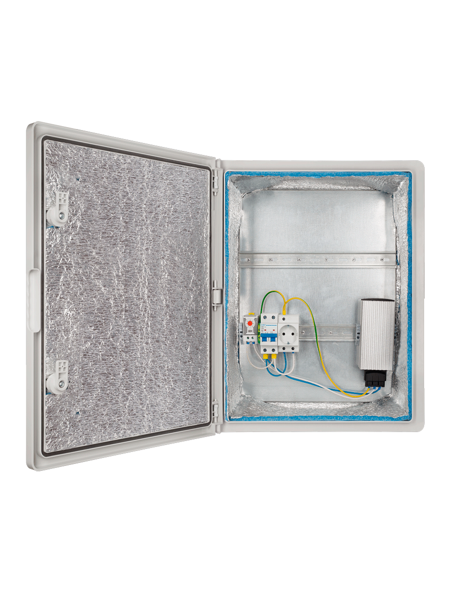- Предустановленное оборудование микроклимата: Двухполюсный автоматический выключатель 16А, Розетка 2P+N 16А, Терморегулятор, Обогреватель.